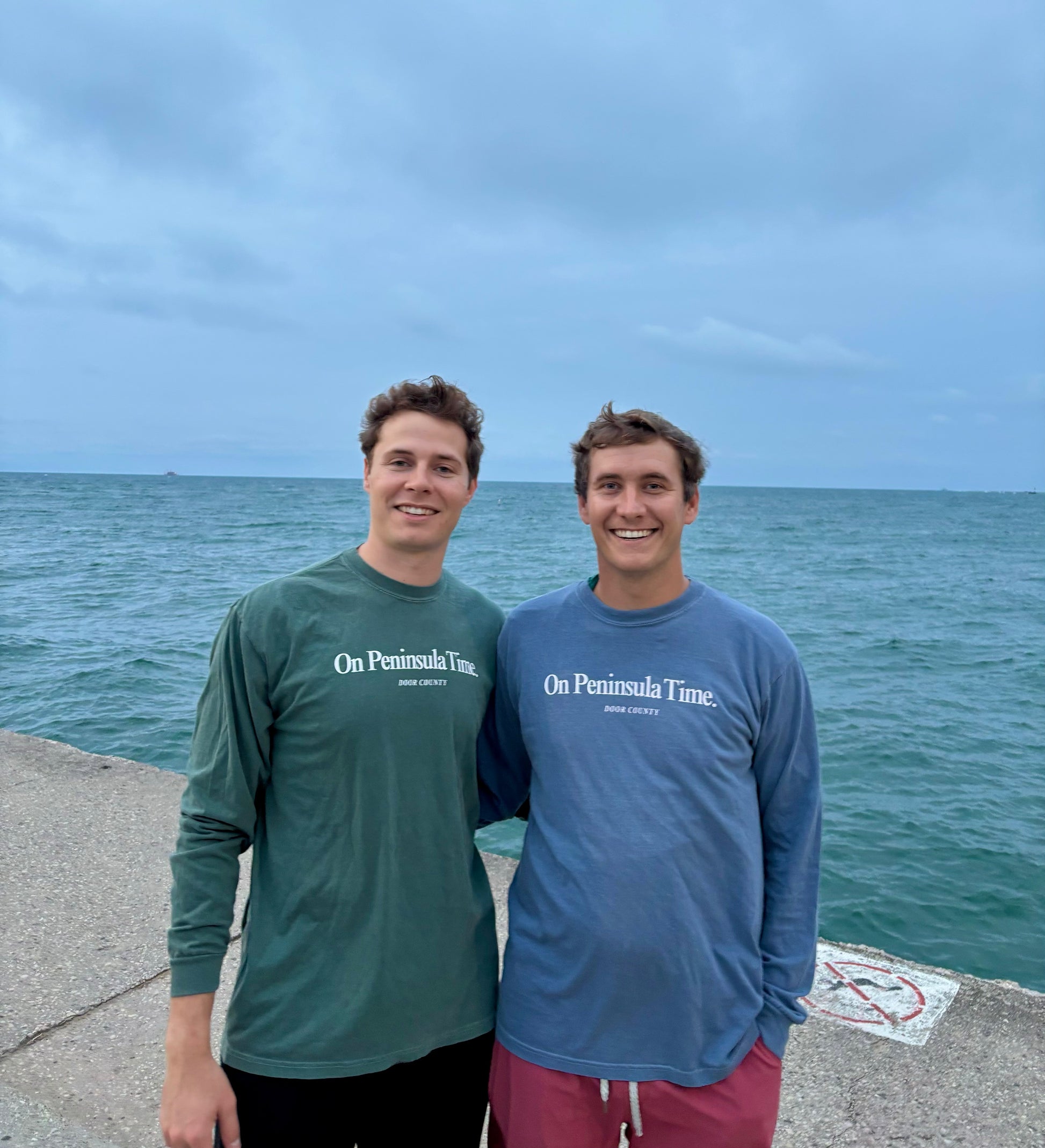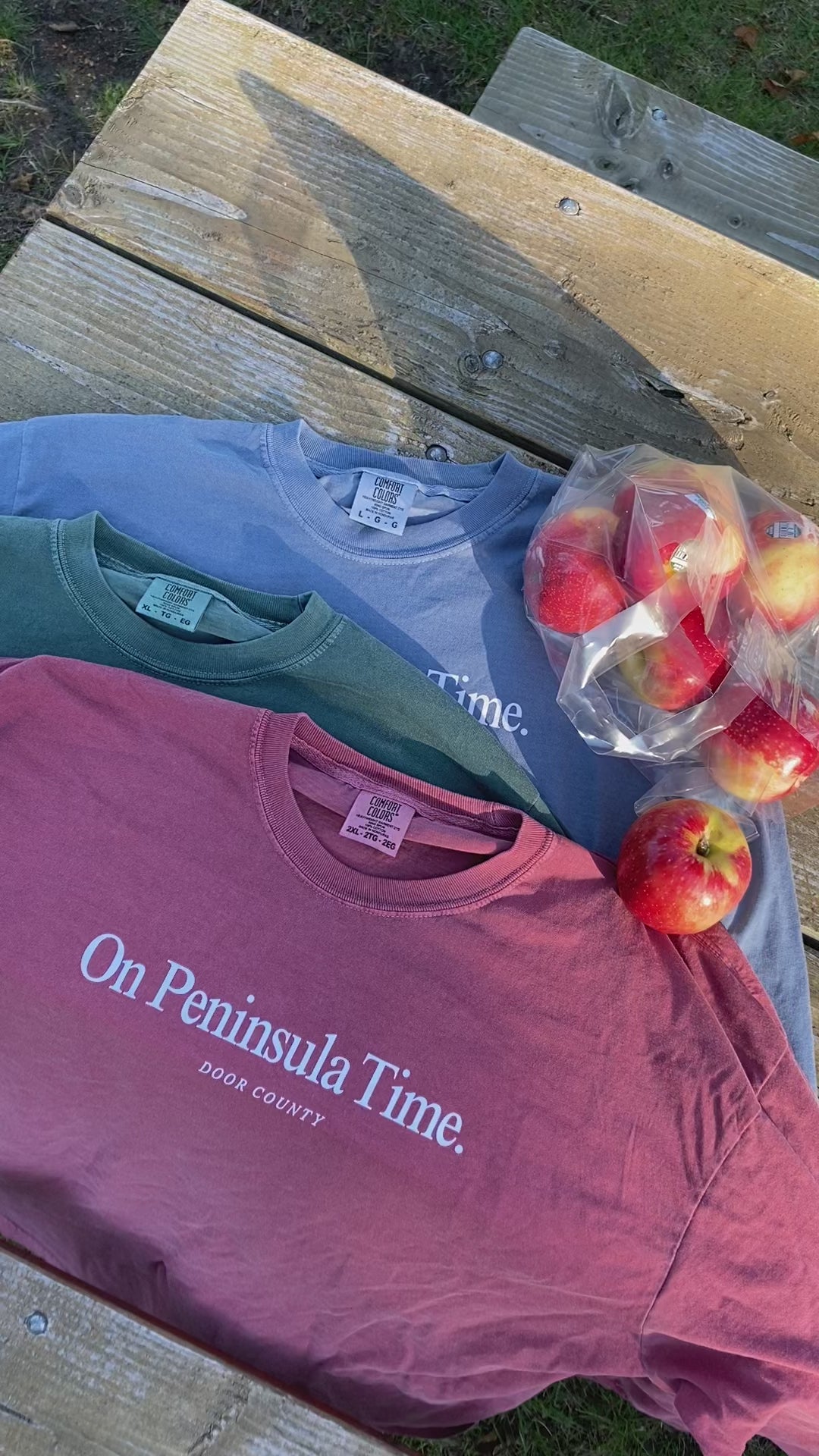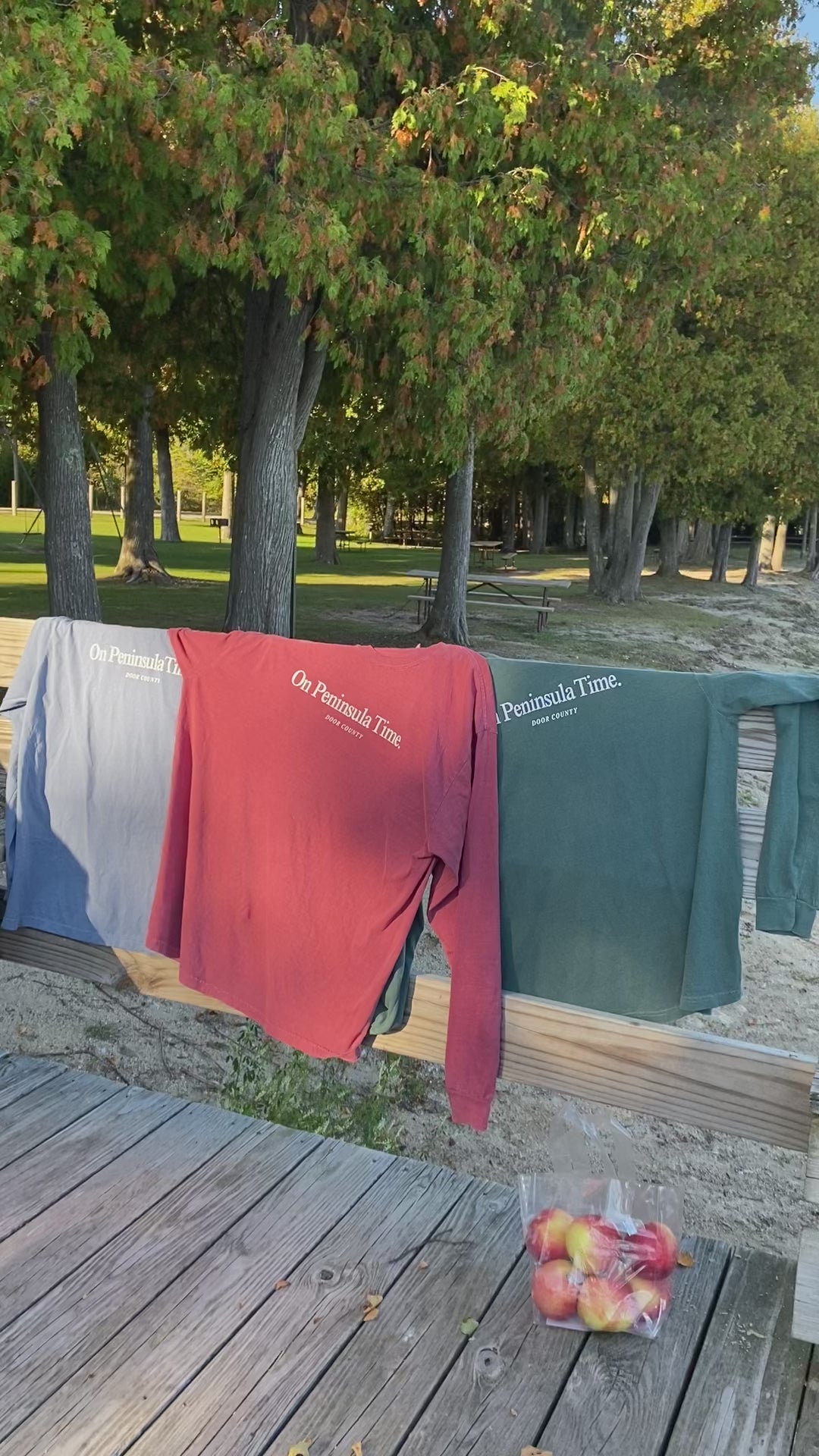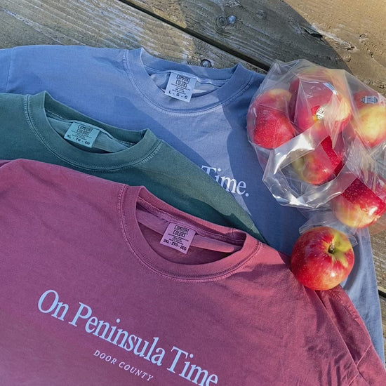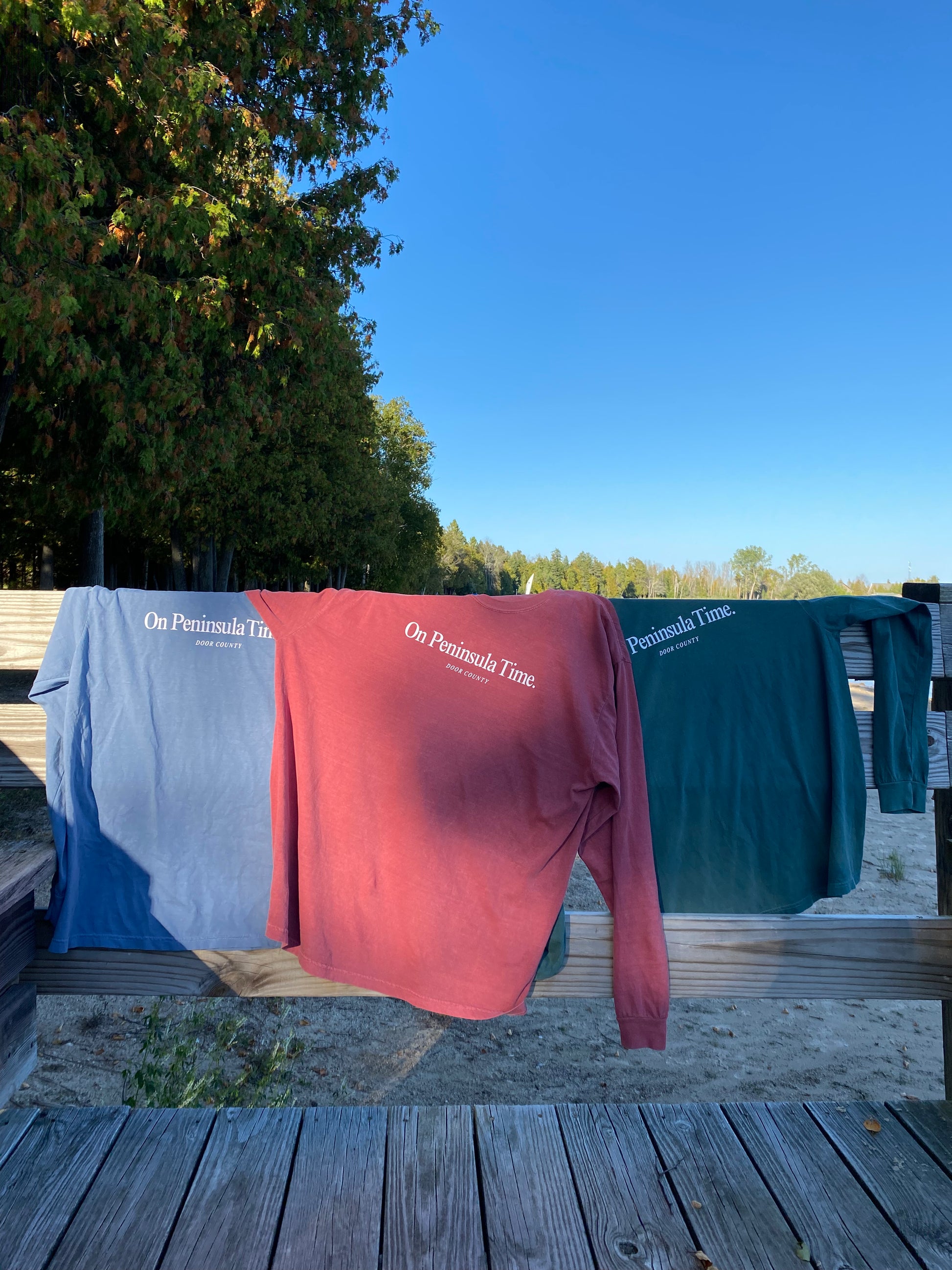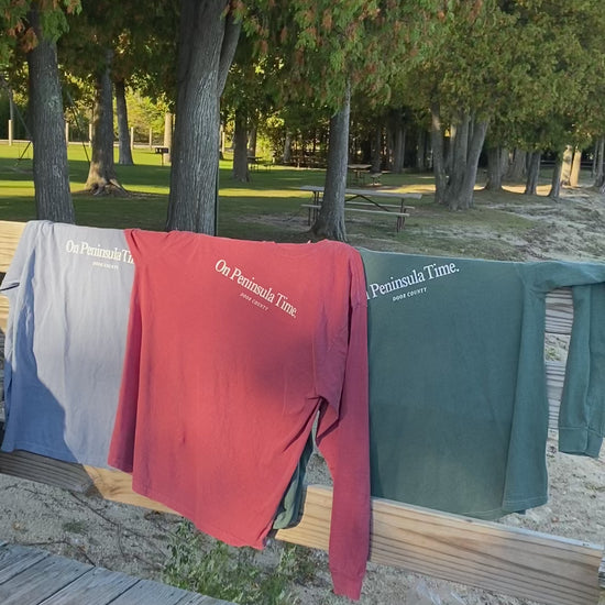 Whether you're catching the sunrise over Lake Michigan or unwinding after a day on the bay, this long sleeve tee fits right into the Door County rhythm. Soft, breathable, and easy to layer, it’s a go-to for everything from cool mornings at the cabin to late-night fire pits. The front features our laid-back motto "On Peninsula Time." in a relaxed script, while the back keeps it simple with our classic sailboat logo just below the collar.