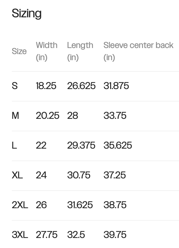 - 3XL: W 27.75in / L 32.5in / Sleeve Center Back 39.75in